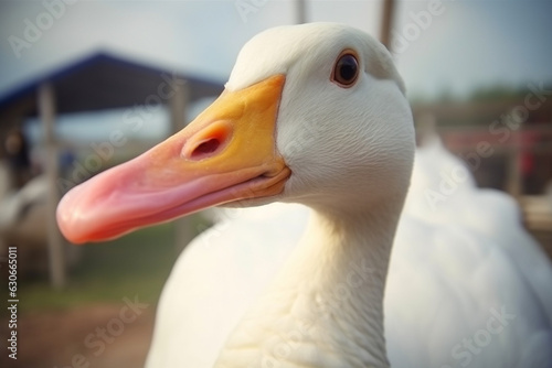 Happy goose roaming free on farm meadow. Farm animal welfare and care. Generative Ai
