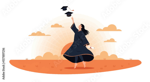 Happy Graduate Celebrates Academic Achievement By Throwing Graduation Hats