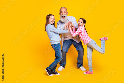 Happy grandfather enjoys playful moment with granddaughters in vibrant yellow background