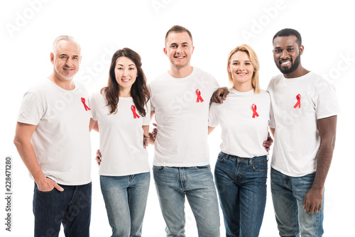happy group of people in blank white t-shirts with aids awareness red ribbons looking at camera isolated on white