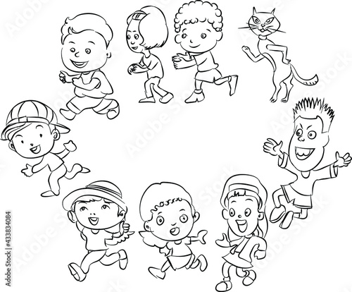 Happy group of peoples in circle. Doodle style line art illustration.