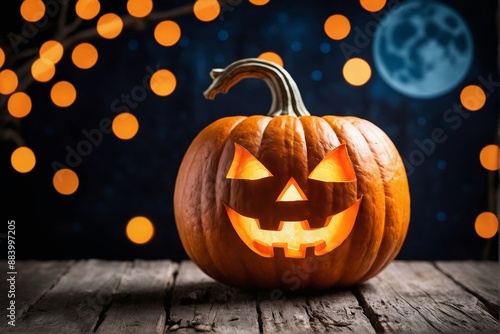 Happy Halloween background with copy space. A scary pumpkin Jack-O'-Lantern smiling on a grunge wood and bokeh night dark background