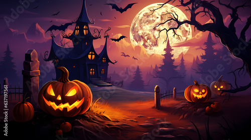 Happy Halloween background with scary pumpkins and castle haunted .Halloween background with Evil Pumpkin. Spooky scary dark Night forrest. Holiday event halloween banner background concept