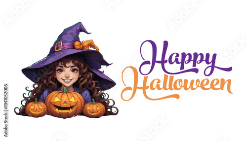 Happy Halloween Banner Vector Design. Little cute girl in a witch costume with pumpkins. Halloween design.