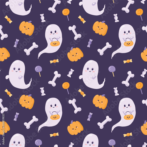 Happy Halloween childish seamless pattern with ghost and pumpkin