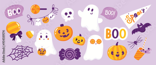 Happy Halloween day element background vector. Cute collection of spooky ghost, pumpkin, bat, candy, skull, spider. Adorable halloween festival elements for decoration, prints.