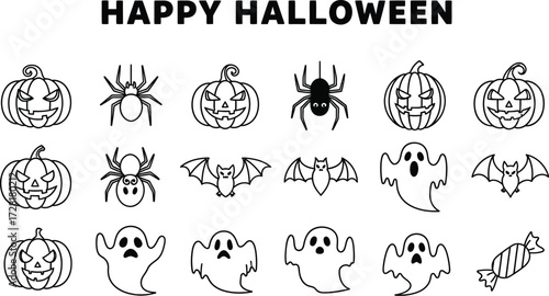 Happy halloween set with pumpkins, spiders, bats, ghosts, and candy, perfect for greeting cards