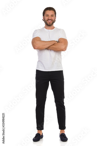 Happy Handsome Man Is Standing With Arms Crossed. Front View.