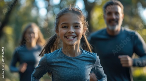 happy healthy family, cute kid,father and mother jogging for exercise together in the morning sunrise