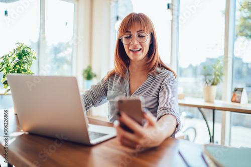 Happy hipster blogger in classic glasses feeling good from fast installation mobile application for sharing media files, Caucasian red hair woman checking notification for cellphone gadget