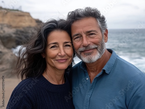 Happy Hispanic couple enjoying peaceful day at rocky coast