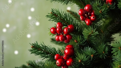 Happy Holidays Text with Christmas Evergreen Branches and Red Winter Holiday Berries in Corner Over Rustic Wooden Background