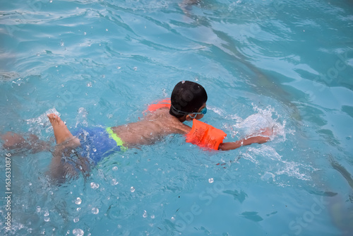 Happy Indian boy swimming in a pool, Kid wearing swimming costume along with air tube during hot summer vacations, Children boy in big swimming pool.