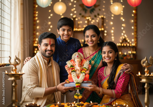 happy indian family celebrating ganesh chaturthi together at home