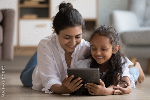 Happy Indian little kid and mom using digital tablet, resting on heating floor at home, smiling, laughing. Mother and child enjoying leisure, watching movie, reading book online