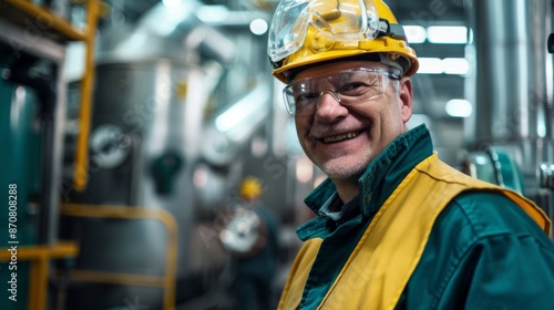 Happy industrial worker wearing safety gear and smiling in a manufacturing plant. The image captures a positive work environ