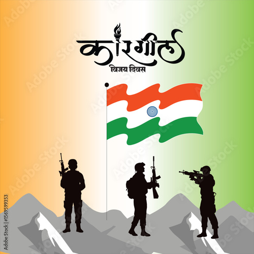 HAPPY KARAGIL VIJAY DIWAS soldier is wearing a camouflage uniform and has a turban on his head. The mountain is depicted in shades of grey and white. indian flag holdin hand