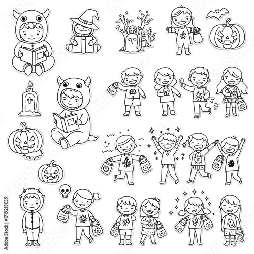 Happy kids in Halloween costumes trick or treating with pumpkins and candy bags, perfect for seasonal greeting cards and decorations.