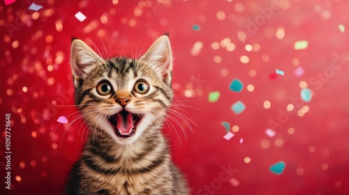 Happy kitten celebrating with confetti against a vibrant red background at a joyful gathering