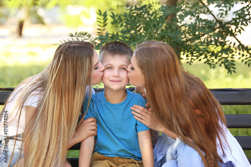Happy lesbian mothers kissing foster son in park. Adoption concept