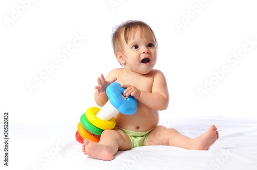 Happy little child rejoice at pyramid toy