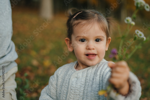 Happy little girl picking wild flowers in the meadow. Autumn seasonal outdoor activities for kids. Child explores nature.