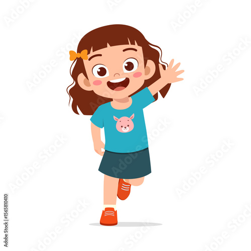 Happy little girl waving hand wearing blue shirt and orange bow on a white background