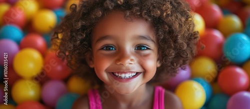 Happy little girl with curly hair smiles brightly while playing in a ball pit.