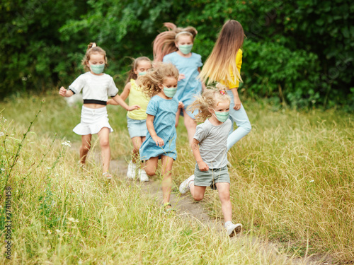 Happy little kids wearing protective face mask jumping and running on meadow, forest. Looks happy, cheerful, sincere. Copyspace. Childhood, pandemic concept. Healthcare, coronavirus pandemic.