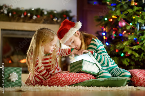 Happy little sisters wearing Christmas pajamas opening gift boxes by a fireplace in a cozy dark living room on Christmas eve.