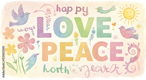 Happy Love Peace Earth Pastel Floral Illustration with Birds