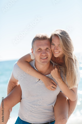 Happy loving couple,young blond woman having fun on the beach near the blue ocean,a girl is sitting on the back of a guy hugging his neck the girl wears a ring on his right hand,he wears a gold chain