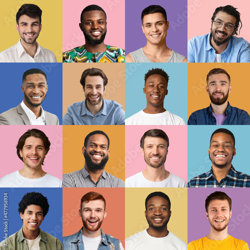 Happy male faces over colorful studio backgrounds, collection of avatars