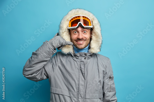 Happy male snowboarder wears winter jacket with hood makes phone gesture smiles positively isolated over blue background. Man skier enjoys favorite hobby asks to call him. Vacation and travel