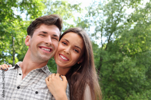 Happy man and woman stand in park;