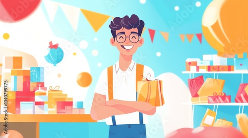 Happy man holding gift bags in a festive store with colorful decorations.