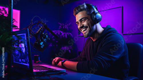 Happy Man Recording Social Media Podcast in Neon Studio with Blogging Equipment, ai generative