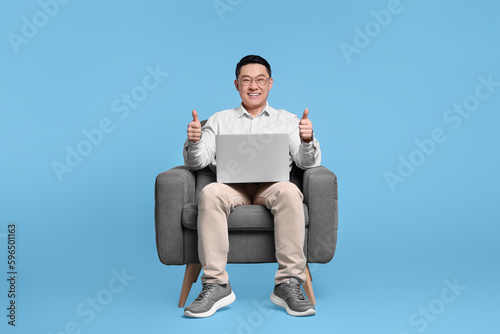 Happy man with laptop showing thumb up gesture while sitting in armchair on light blue background