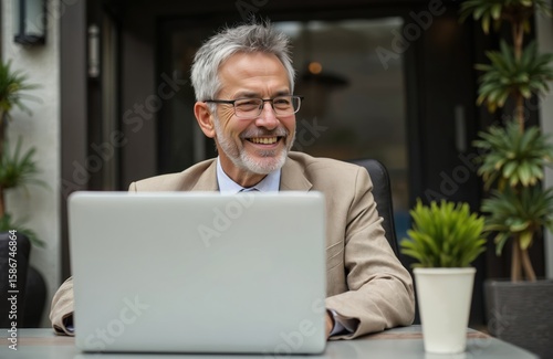Happy mature businessman with glasses works on laptop outdoors. Smiling middle aged pro man, entrepreneur, sits at table, hybrid working lifestyle. Copy space.