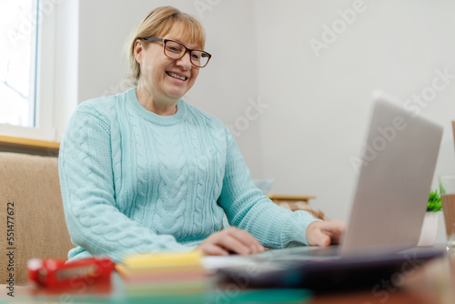 Happy mature businesswoman accountant in glasses and turquoise jumper sitting on the couch with laptop, taking notes, holding papers, contract studying or working remotely online from home