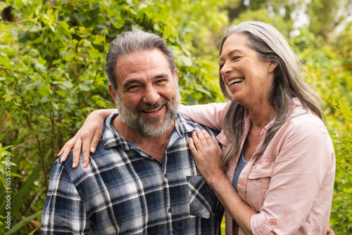 Happy mature couple laughing together in lush garden, enjoying outdoor moments