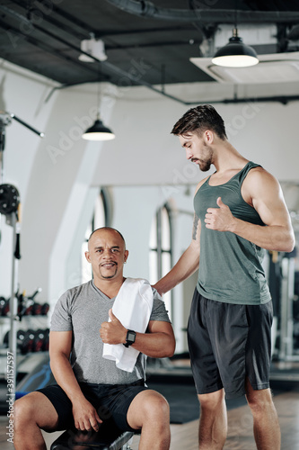 Happy mature fit mixed-race man and his coach showing thumbs-up after finishing working out in gym