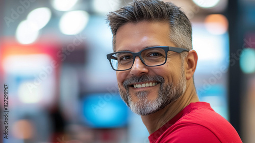 Happy Mature Man Smiling Glasses Red Shirt Portrait