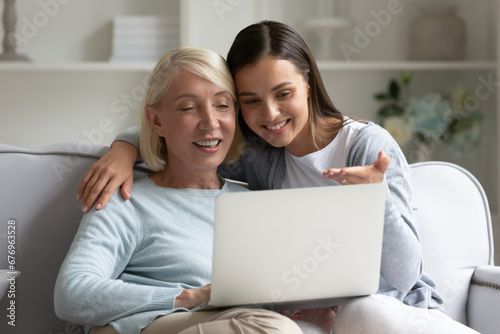 Happy mature mother and adult daughter using laptop, surfing internet or shopping online, older grandmother and granddaughter looking at computer screen, watching video or movie, having fun at home