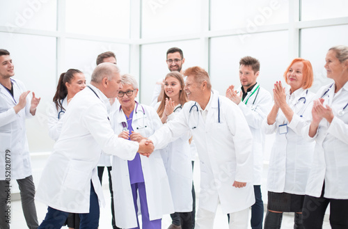 happy medical colleagues shaking hands with each other.