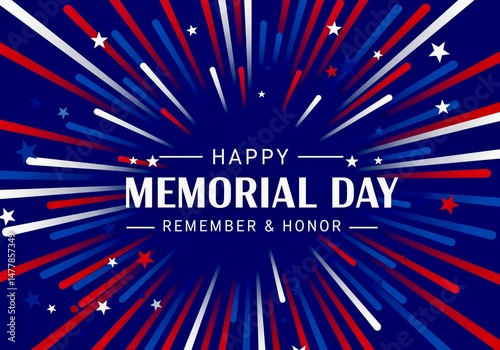 "Happy Memorial Day" is written in white text, with "REMEMBER & HONOR" below, against a blue background with red and white lines radiating outward.