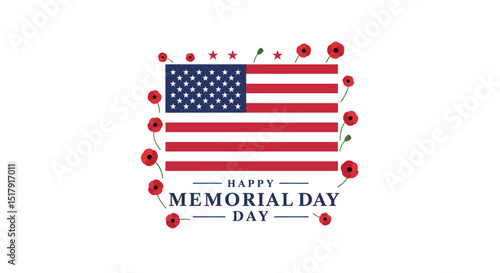 Happy Memorial Day with American Flag and Red Poppies on a White Background