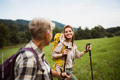 Happy mid adult woman with trekking poles hiking with active senior mother outdoors in nature.