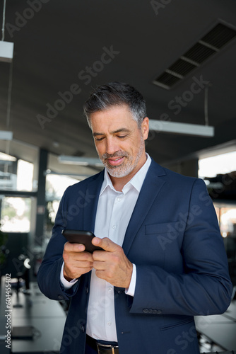 Happy mid aged business man ceo wearing blue suit standing in office using cell phone. Mature businessman professional executive manager holding mobile checking applications on cellphone. Vertical