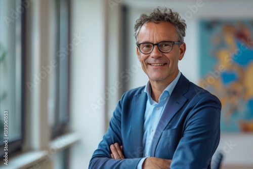 Happy middle aged business man ceo standing in office arms crossed